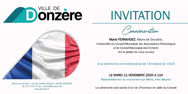 La Ville de Donzère vous invite à participer à la cérémonie commémorative de l’Armistice du 11 novembre 1918, en présence des élus, des anciens combattants, du Conseil municipal des enfants et des associations locales.